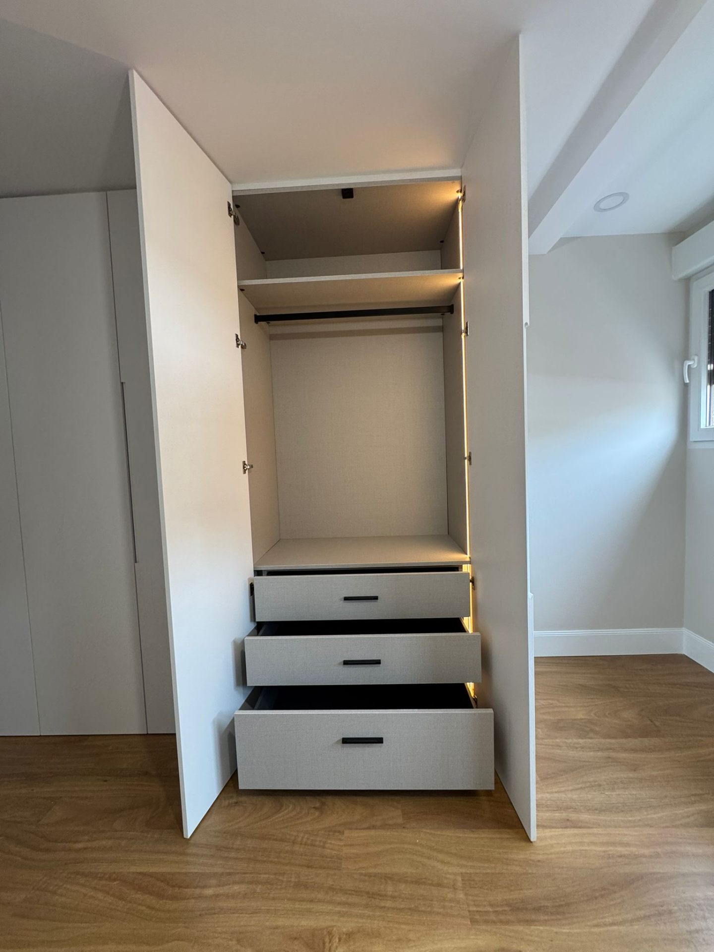 Dormitorio principal con armario empotrado de suelo a techo con iluminación LED interior, suelo de parquet en espiga, techos con iluminación indirecta y acabados premium.