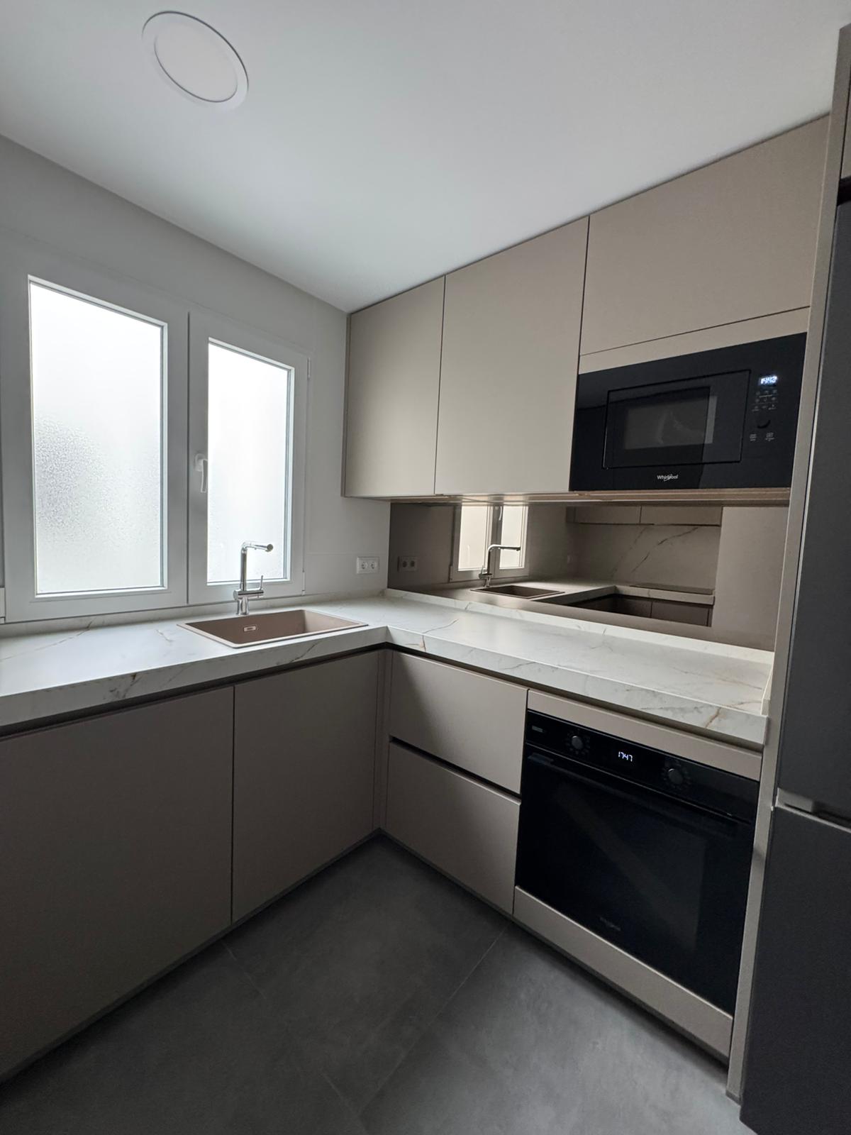 Transformación completa de vivienda con redistribución de espacios, nueva instalación eléctrica, climatización por splits, suelos de parquet y cocina con electrodomésticos integrados.
